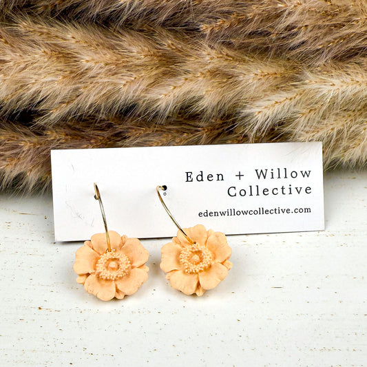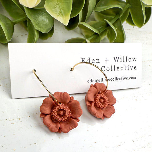 Terracotta Poppy Flower Earrings – Handmade Polymer Clay Hoops for Everyday Boho Style