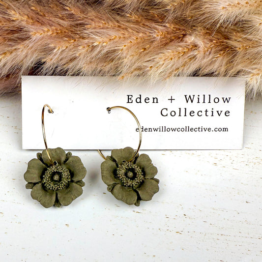 Olive Green Poppy Earrings – Handmade Clay Floral Hoops for Everyday Boho Style