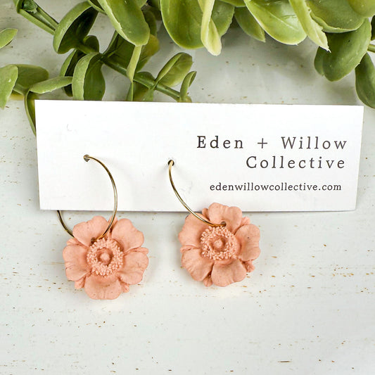 Light Pink Poppy Earrings – Handmade Polymer Clay Floral Hoops for Everyday Boho Style