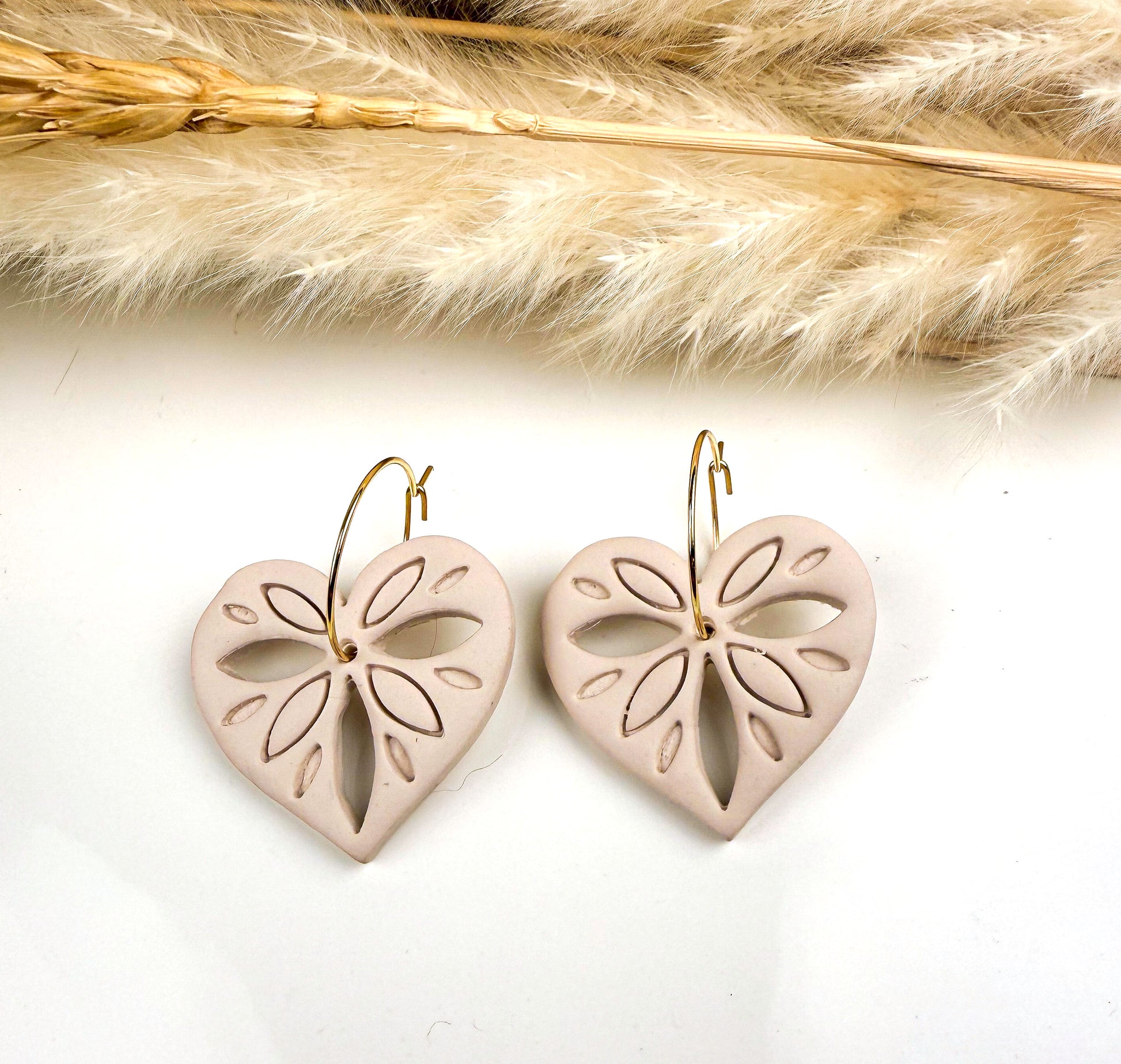 These heart hoop earrings are the perfect blend of soft romance and effortless boho style. Handcrafted from lightweight polymer clay, each heart features delicate cutout details and hangs from gold-plated hoops for an airy, flattering fit you can wear all day long.